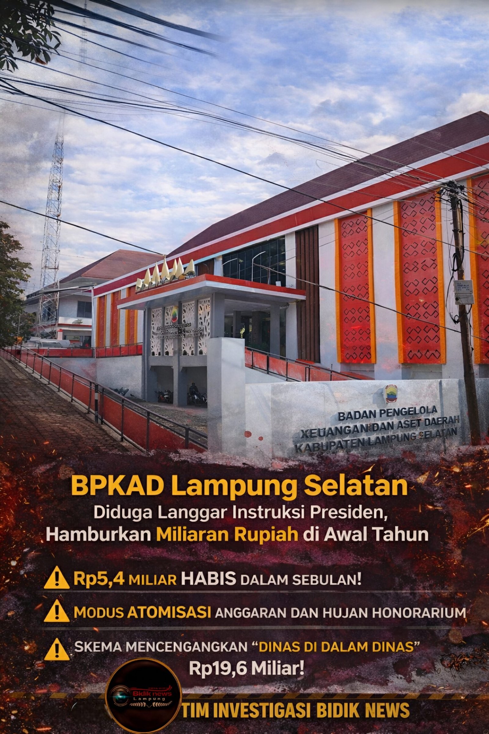 LAMPUNG SELATAN, BIDIK NEWS โ Aroma skandal besar dalam pengelolaan keuangan daerah mencuat dari Badan Pengelola Keuangan dan Aset Daerah (BPKAD) Kabupaten Lampung Selatan. Tim Investigasi Bidik News mengungkap dugaan praktik penyimpangan anggaran yang terjadi secara sistematis pada Januari 2025 periode yang seharusnya menjadi fase awal pelayanan publik, bukan ajang โpesta anggaranโ.