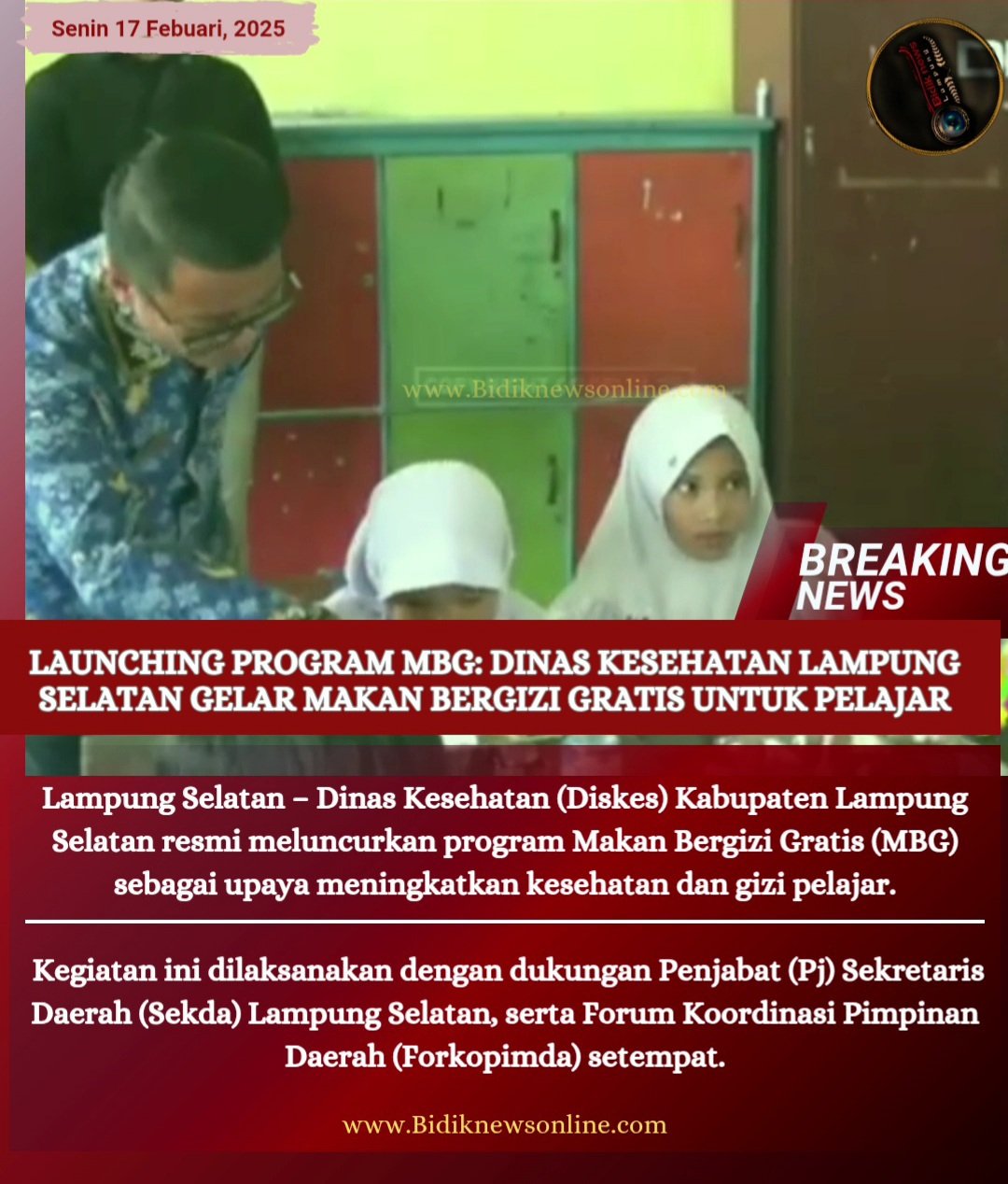 Bidik News, Lampung Selatan โ Dinas Kesehatan (Diskes) Kabupaten Lampung Selatan resmi meluncurkan program Makan Bergizi Gratis (MBG) sebagai upaya meningkatkan kesehatan dan kecukupan gizi pelajar. Kegiatan ini dilaksanakan dengan dukungan Penjabat (Pj) Sekretaris Daerah (Sekda) Lampung Selatan serta Forum Koordinasi Pimpinan Daerah (Forkopimda) setempat.